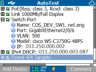| Авто тест - получение информации о ближайшем коммутаторе, шлюзе, DHCP и DNS серверах (наименование, модель, порт, IP адрес, VLAN) | Да | Да |